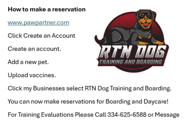 Call or Text 334- 625-6588 Rtndogtraining@gmail.com Booking Link: <<https://pawpartner.com/rtn-dog-training-and-boarding<<